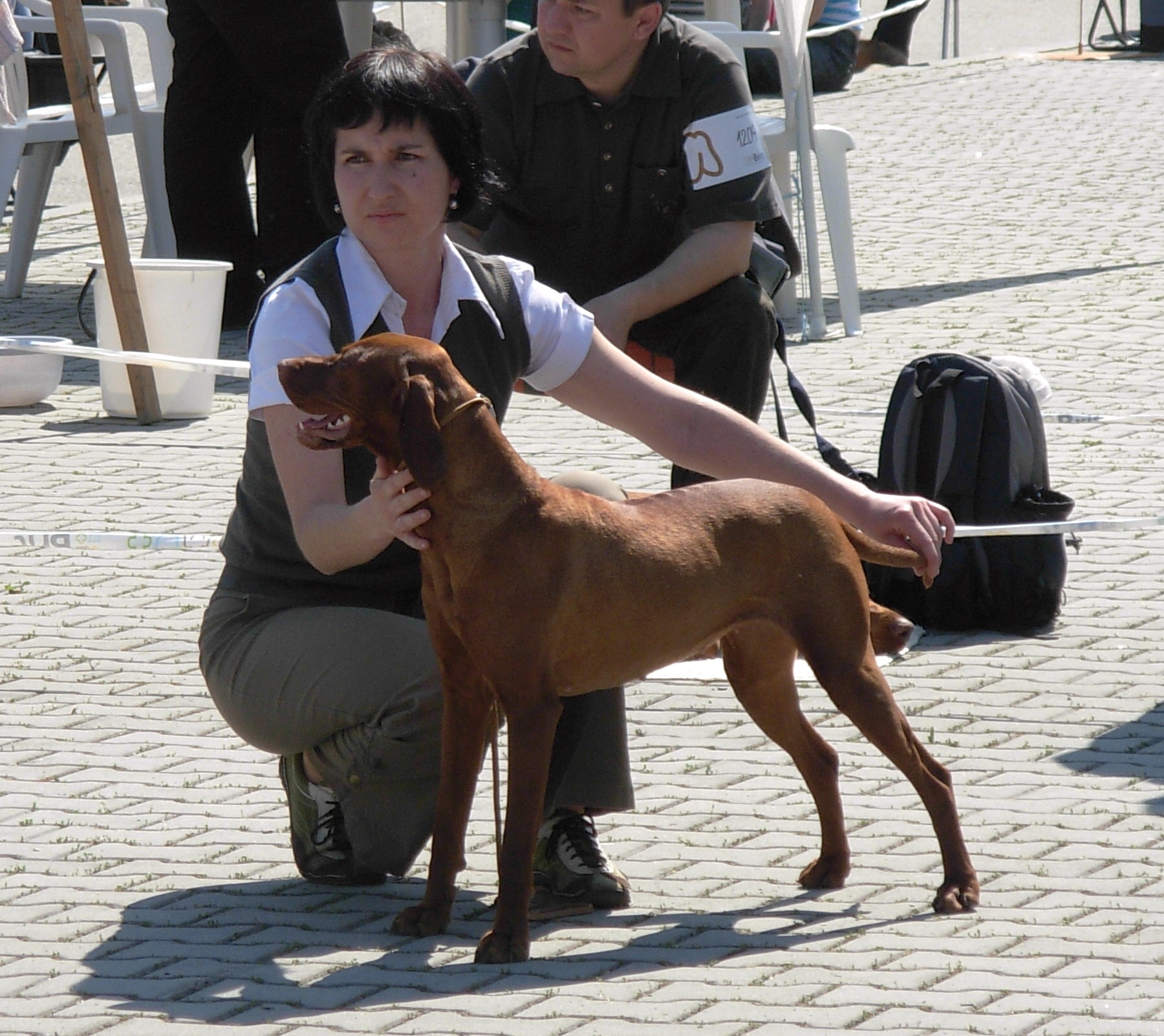 Tak mě zas panička vyvezla na další otravnou akci. Zase výstava, zase Budějovice. Jel se mnou i Adir, tak aspoň nějaká spřízněná otrávená duše. Počasí se teda moc vydařilo. Krásně svítilo sluníčko a já jsem se mohla opalovat před posuzováním u kruhu a chytat tmavší bronz. Panička při posuzování MOKů povzbuzovala nejvíc naše kamarádky Bashu a Ebi, ale stejně to nikdo okolo moc nevnímal. Ale možná to pomohlo. Na to, že pan rozhodčí moc dobrých známek nedal a tituly vysloveně šetřil, Ebi ohodnotil v mezitřídě V2 a Basha byla jako šampionka nejkrásnější maďarská fena s CACIBem. Oběma moc gratulujem. A na nás ze zase pan rozhodčí vyžil. Koukal na mě se slovy: „Tohle že je žemlová barva? Pro Boha pani, kde jste tohle vzala?“ To mě teda otrávilo a odmítla jsem ze sebe dělat šaška a už jsem se nepředvedla. Všechny čtyři moje kolegyně v třídě pracovní, i já, jsme dostaly VD, „ta s tou barvou“, tedy já, jsem byla bez pořadí. Asi jsem ale zas o moc horší nebyla. Doufám, že mě panička příště vezme na zábavnější akci. A Adir? Ten vybojoval se svým páníčkem nejlepšího veterána a to je teda taky moc krásný výsledek.
