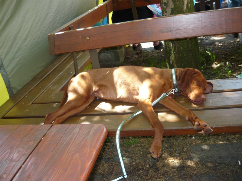 Na výstavě posuzoval setry, maďary a některé další ohaře Andrzej Brabletz z Polska, ale nikdo mu nerozuměl, kdyby mluvil aspoň maďarsky ... Ku vší smůle do třídy veteránů nastoupil s Adirem ještě jeden veterán z Německa, který mu V1 vyfoukl. Panička mě nechala odpočívat ve stínu stromů, takže když jsem přišly na řadu k posuzování do plně osluněného kruhu, byla jsem fit a zchlazená. Soupeřily s námi v třídě pracovní feny Danja Lovely Face a Chiquita z Blanenských lesů, které se už jistě nejedné výstavy zúčastnily a holky byly fakt pěkné. Panička se při předvádění moc snažila. Pan rozhodčí nad námi všemi kroutil hlavou a nelíbily se mu naše ťapičky, že je prý máme všechny „křivé“. Pak rozdal konečné pořadí. Zase se stal div. Všechny jsme dostaly výbornou, já V1, Danja V2 a Chiquita V3. Titul ale bohužel nezadal a to asi proto, že bych ho měla mít já. To byla panička poprvé na výstavě opravdu vysloveně naštvaná, že nám CAC nebyl dopřán. Odpoledne jsem se setkali s mým novým kamarádem jagdteriérem Royem (Abran z Hradska-Liska). Jeho páníček s výsledkem VD2 taky nebyl moc spokojený. Takže co se týká úspěšnosti, zase malinko vypráskaná akcička. Ale co, měli jsme zase príma výlet, s Royem jsem se příjemně poškádlili pod lavicí ve stínu a byly nějaké zážitky. Občas na mě padla únava, tak jsem si musela odpočinout. Když všichni posedávali po těch lavicích, zvolila jsem i tuto možnost a ne ležet na té špinavé zemi. Před odjezdem mi panička za odměnu ještě odhodila na parkovišti kachnu a i když jsem byla strašně zmordovaná z toho tepla, ráda jsem bez zaváhání kachnu donesla a bylo to pro mě fajn rozptýlení.