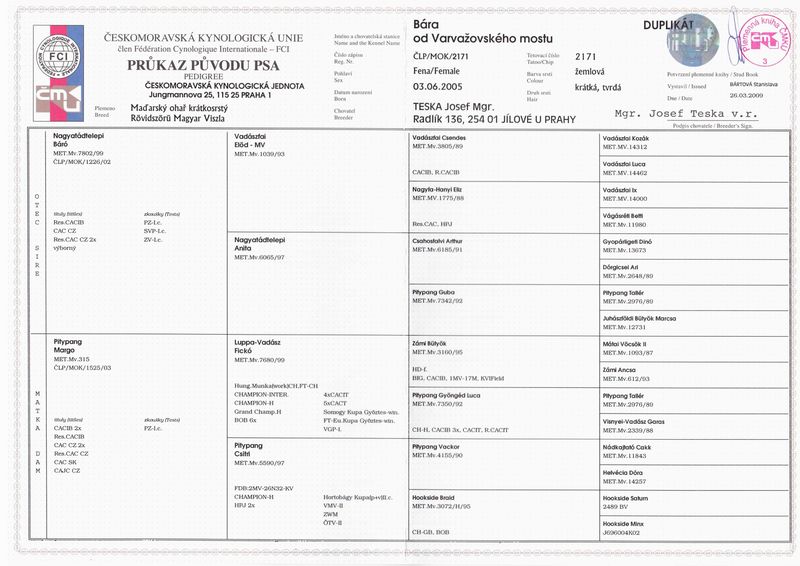 Výstavy: výborný, 28x CAC, 10x CACIB, 4x Cruft’s Qualification, 2 X res.CACIB, 11x BOB, 2x BOG I., 4x res. BOG, 4x BOG III., 1x BIS I., 4x Best Hungarian Breed