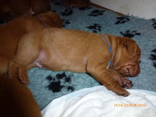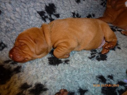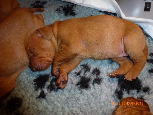 Božínku to to paničce trvalo, než si našla chvilku, aby aspoň povrchně napsala, že se mi v neděli 12.4.2015 narodila Déčková štěňátka. Nebylo překvapením, že porod zase nešel jak měl a opět mi museli pomoci na veterině Neovet v Čáslavi. Už od soboty mi nebylo dobře, zvracela jsem a v neděli odpoledne jsem v sobě neudržela ani vodu. Panička mě raději na kliniku odvezla už odpoledne, ale tam nás ujistili, že je to z blížícího se porodu, dali mi nějaké meducíny a zase jsme jely domu. Asi za hodinu v 18.45 h to opravdu začalo. Ovšem jak to začlo, tak to skončilo a zase se nic nedělo. Zopakovaly jsme si předloňské září a na svět se mezi 21. a 22. hodinou vylouplo císařským řezem 6 zrazavých pomačkaných kuliček. Tentokrát v poměru pohlaví 2 holky a 4 kluci. Nebyli to žádní drobci a jejich žrací a růstová schopnost je neuvěřitelná. Teď, ve 14. dnech věku, váží všichni přes kilo, největší pejsek má 1400 g a je jich plná bedna. Už se jim začínají otvírat očíčka. Korynka je skvělá starostlivá a pečlivá maminka. V týdnu jsme po domluvě s novými páníčky vymysleli jména, tentokrát to budou: Debra a Darah, Dexter, Darwin, Dimo a Dash.