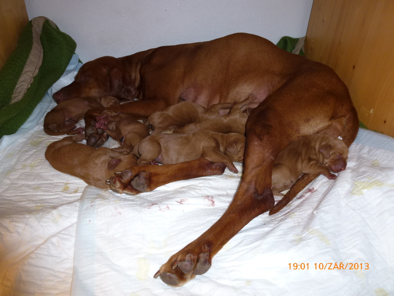 Porod se blížil a já dostávala různá privilegia, hlavně to, že jsem mohla být doma a spát s paničkou v pokoji. 9.9 už mi vůbec nebylo dobře a večer v 9 hodin to začalo. I když ne všechno probíhalo hladce jako běžný fenčí porod. Jak to začalo, tak to právě zase přešlo. Bylo mi spíš na spaní a známky porodu už nebyly žádné. Nezbylo, než se obrátit na odbornou pomoc a jet na spolehlivou veterinu do Čáslavi. Byla to záchrana. A verdikt? Některá štěňátka už byla unavená a potřebovala se co nejdříve dostat na světlo světa. Buď se dalo zkusit vyvolat porod nebo jít rovnou na operaci. Panička se rozhodla pro variantu druhou, aby to bylo bez zbytečných bolestí a nejbezpečnější pro mě a pro mimča. Sice císařským řezem, ale přišlo na svět 7 malých obříků, 4 fenky a 3 pejsci. Všichni byli krásní, zdraví, až moc čilí. Bylo žádoucí, abych se dala co nejdřív do pořádku a mohla začít ty malé opečovávat. Panička mi byla maximálně nápomocná. Jsme do teď vděčné za konzultace o porodu s Dášou Munžilovou, nikdy nezapomenu na silnou psychickou podporu Karla a Katky od Glena, za královské rady při porodu poradkyni chovu MOK Sylvě Lepičové a za profesionalitu klinice NEOvet, kteří zachránili všechna má štěňátka a hlavně mě. Díky moc všem ještě jednou.